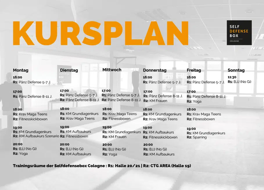 Hier findest Du die Trainingszeiten und unsere Adresse für unser Krav Maga Training in Köln in der Selfdefensebox Cologne.
